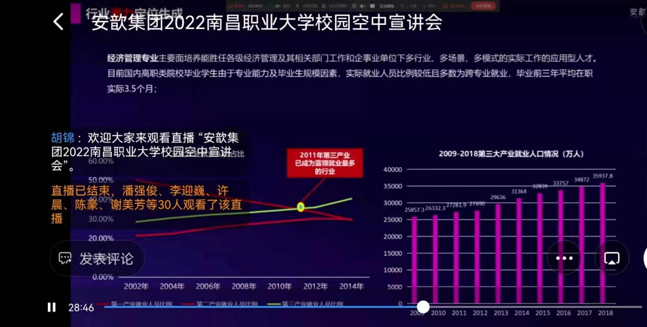 本网讯 经济管理学院王东泉 胡锦报道 为了全力促进经济管理学院2022届毕业生实习就业,让毕业生更充分、更高质量实习就业,我院于2021年11月29日下午14:00-17:00举行第三场线上招聘宣讲会,招聘会的企业主要有上海锐诩企业管理有限公司(安歆)和九江华亿石油两个公司,面对宣讲的是财务管理专业的两个班级(财务管理B2021/B2022班)、市场营销专业的一个班级 (市场营销B2021班)、物流管理专业的一个班级(物流管理B2021班)以及工商企业管理专业的两个班级(工商企业管理1901/1902班),共244人,其中参与线上宣讲的有220人。与此同时,11月30日下午16:30,公司又一次来到学院各班级进行线下宣讲,与学生交流沟通,为他们指引实习就业的方向,以及为学生提供简历诊断等就业服务指导,一切从学生角度出发,让本次招聘宣讲会顺利举行,效果也进一步提升。
