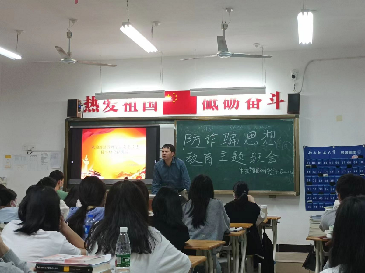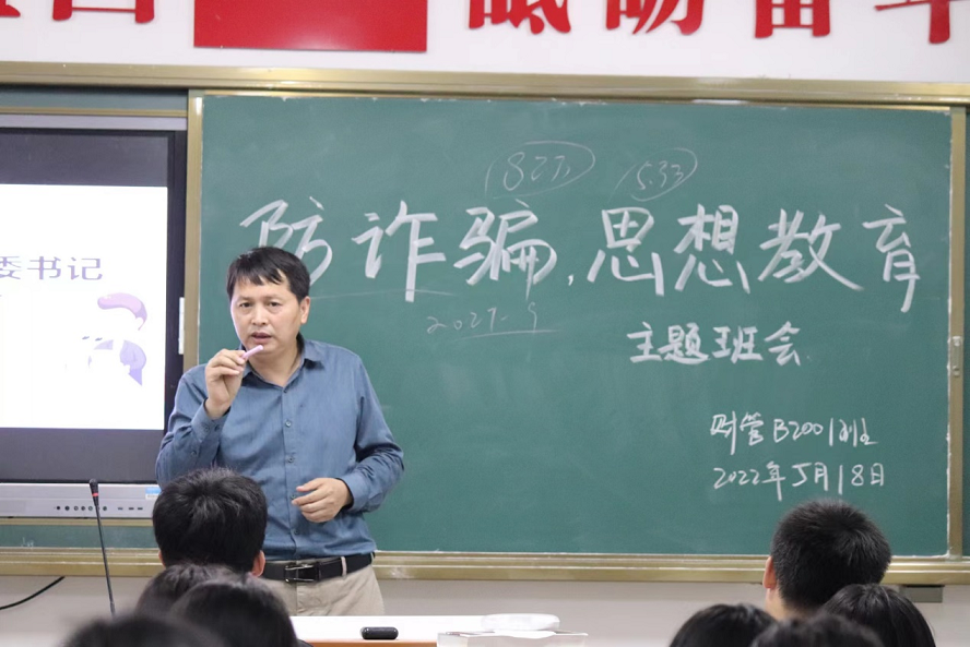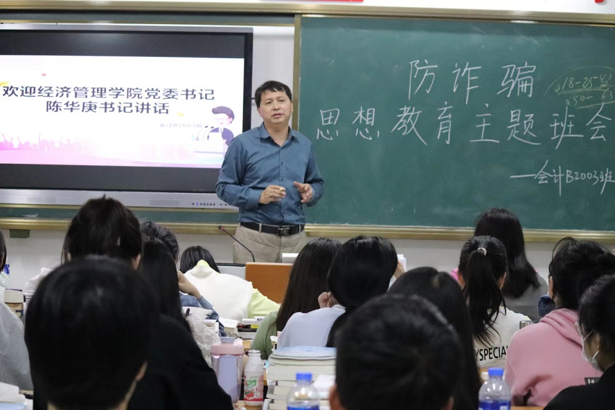 本网讯 经济管理学院陈琴报道 为进一步做好防范治理电信网络诈骗宣传教育工作和加强学生的思想教育建设。经济管理学院党委书记陈华庚于5月18日晚7:30分别在会计B2003班、财务管理B2001班、市场营销B2001班和会计B2002班开展“防诈骗思想教育主题班会”的宣讲。